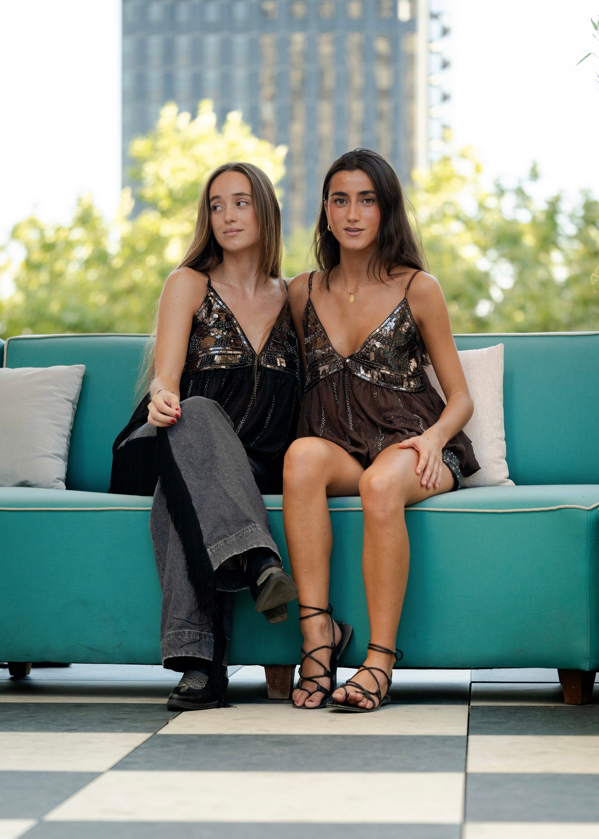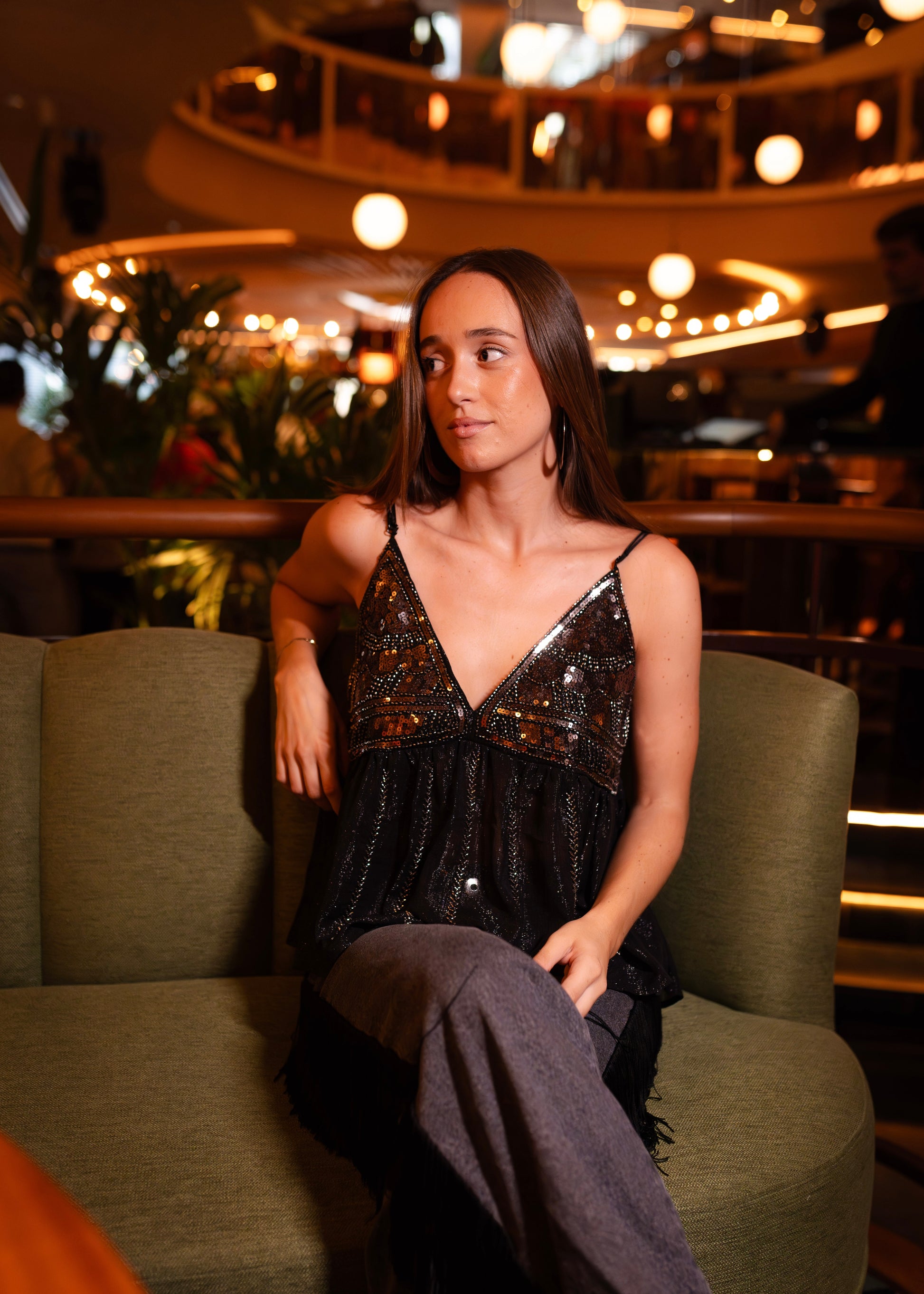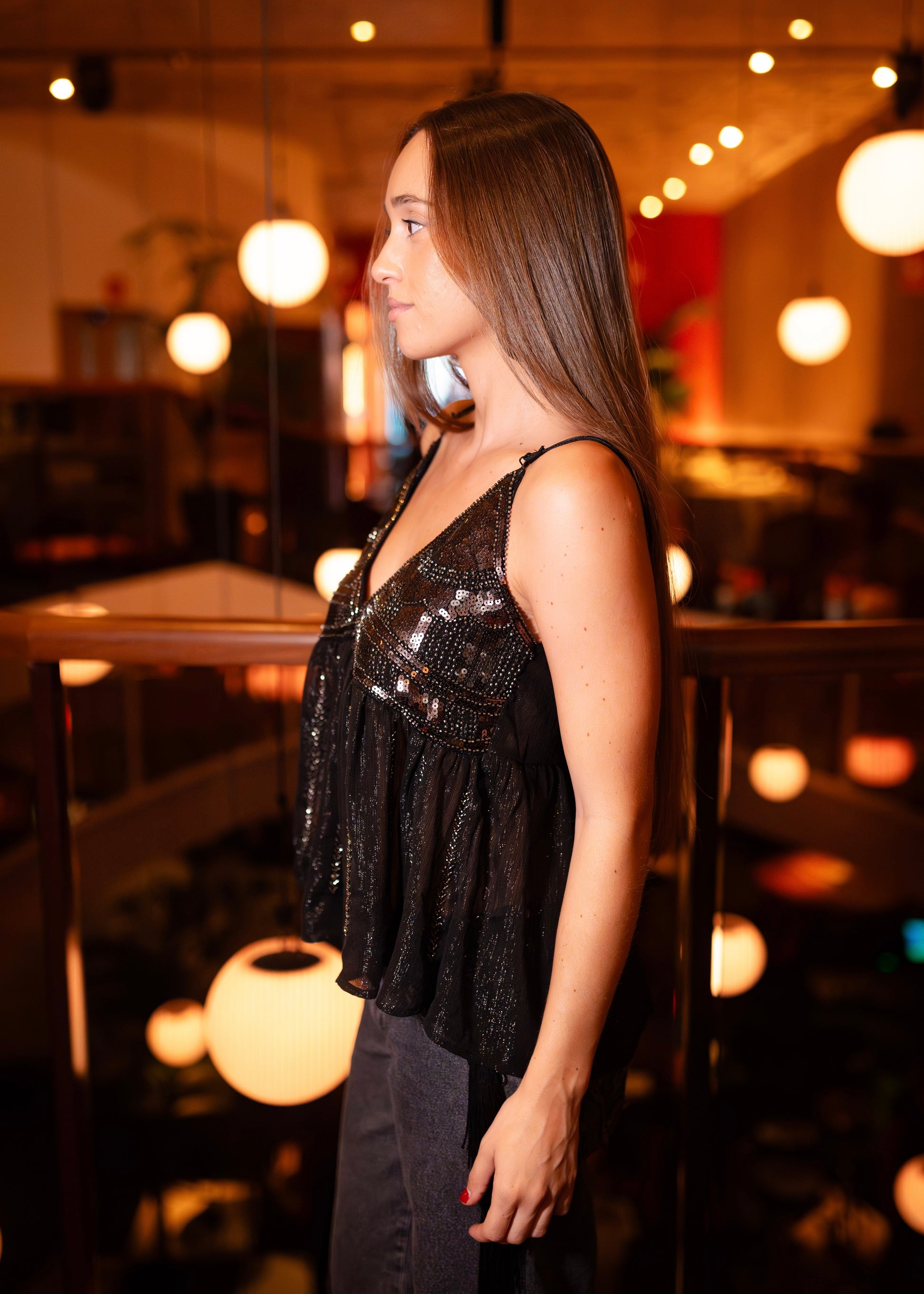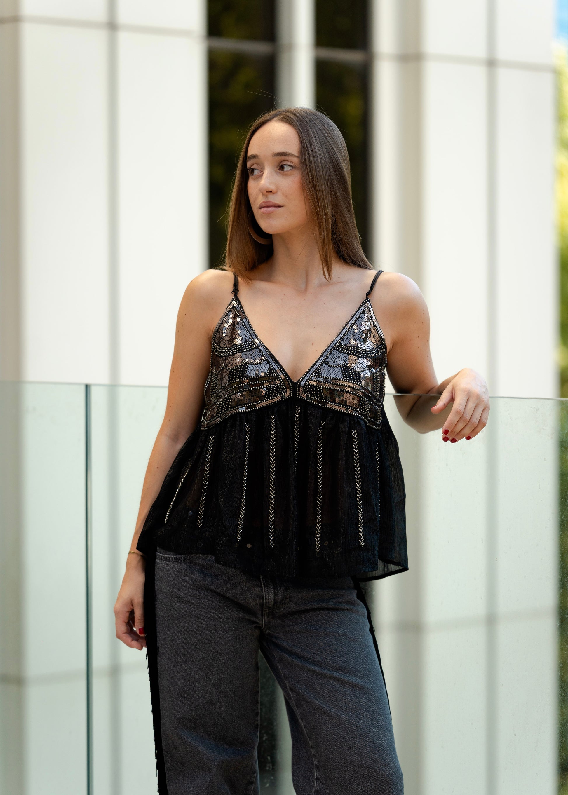 Top de tirantes con lentejuelas en color negro. Con un corte fluido y holgado, combina un escote en V favorecedor con detalles brillantes bordados.