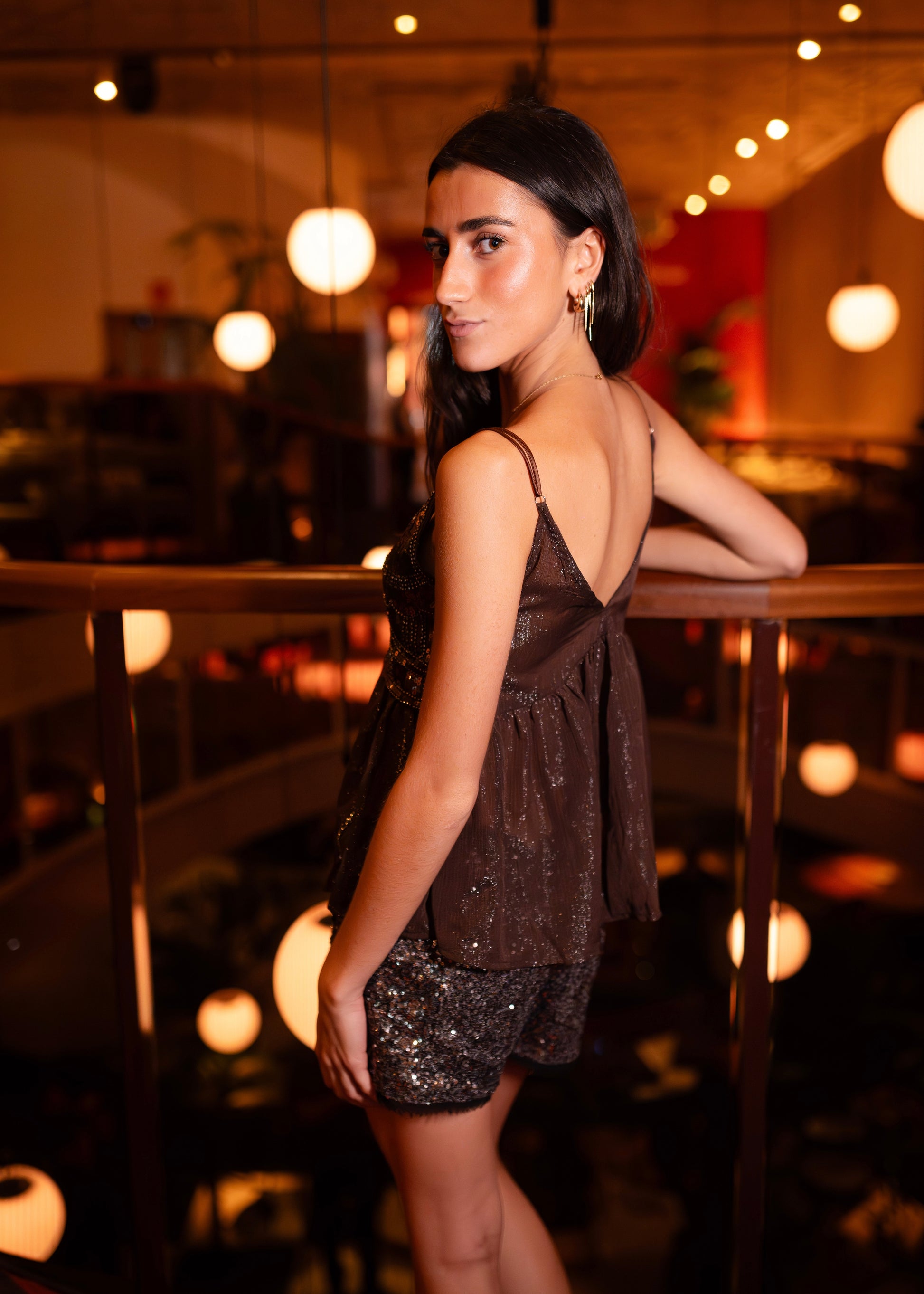 Top de tirantes con lentejuelas en tonos marrones. Con un corte fluido y holgado, combina un escote en V favorecedor con detalles brillantes bordados.